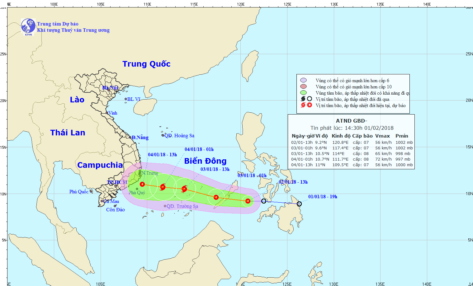 Hồi 4 giờ ngày 4-1, vị trí tâm áp thấp nhiệt đới ở vào khoảng 11,7 độ Vĩ Bắc; 111,8 độ Kinh Đông, cách đất liền các tỉnh Phú Yên-Ninh Thuận khoảng 300 km về phía Đông. Sức gió mạnh nhất ở vùng gần tâm áp thấp nhiệt đới mạnh cấp 6-7 (40-60 km/giờ), giật cấp 9.