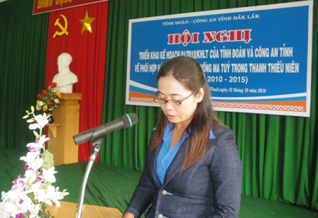 Sáng 22-10, Tỉnh Đoàn và Công an tỉnh đã tổ chức Hội nghị triển khai kế hoạch số 01/2010/KHLT phối hợp hành động phòng, chống ma túy trong thanh thiếu niên (TTN) giai đoạn 2010-2015. Tham dự có đồng chí H’Kim Hoa Byă, Bí thư Tỉnh Đoàn; Đoàn Đình Hón, Phó Giám đốc Công an tỉnh; đại diện ban, ngành hữu quan; các đồng chí bí thư, phó bí thư các Huyện, Thị, Thành Đoàn và đoàn trực thuộc.