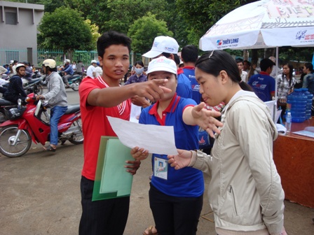 | Đội tiếp sức mùa thi Trường Đại học Tây Nguyên đang hướng dẫn thí sinh tới địa điểm thi |