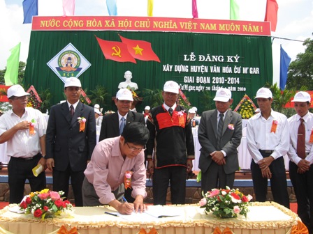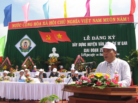Sáng 30-4, huyện Cư M’gar đã tổ chức lễ đăng ký xây dựng huyện văn hoá giai đoạn 2010-2014. Đồng chí Phạm Đức Tùy, Phó Bí thư tỉnh uỷ, đồng chí Y Dhăm Ênuôl, Phó Chủ tịch UBND tỉnh và đại diện lãnh đạo các sở, ban, ngành của tỉnh, huyện cùng hơn 4000 người dân các dân tộc trong huyện đã về dự.