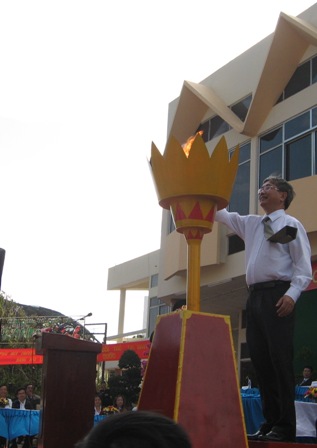 | Đồng chí Trần Ngọc Tuấn, Bí thư Thành ủy Buôn Ma Thuột thắp ngọn đuổc truyền thống tại Lễ giao nhận quân |