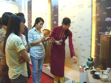 | Nhân viên của Công ty Cổ phần Cà phê Trung Nguyên giới thiệu các hiện vật được trưng bày tại Bảo tàng Cà phê cho du khách |