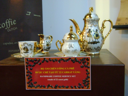 | Bộ ấm chén uống cà phê được chế tạo từ 22 carrat vàng trưng bày tại Bảo tàng Cà phê |