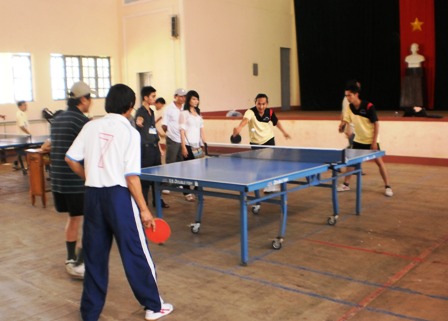 | Đôi vận động viên nam Trường Cao đẳng Sư phạm Dak Lak và Cao đẳng Văn hoá Nghệ thuật Dak Lak thi đấu môn bóng bàn. |