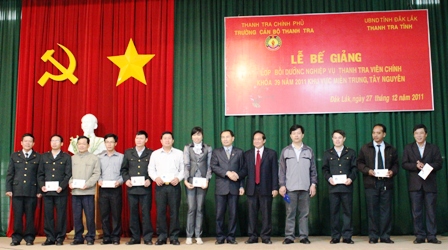 Sáng 27-12, tại Trường Chính trị tỉnh, Trường Cán bộ Thanh tra phối hợp với Thanh tra tỉnh Dak Lak tổ chức bế giảng lớp nghiệp vụ Thanh tra viên chính khóa 39 năm 2011 cho 108 học viên là chánh, phó chánh thanh tra, cán bộ, công chức đang làm công tác thanh tra tại các cơ quan thanh tra của 8 tỉnh thuộc khu vực miền Trung và Tây Nguyên, gồm: Phú Yên, Quảng Ngãi, Khánh Hòa, Kon Tum, Gia Lai, Lâm Đồng, Dak Nông và Dak Lak.
