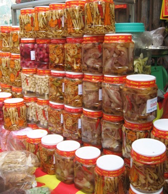 | Nhiều hũ dưa món được bày bán với mẫu mã khá bắt mắt |