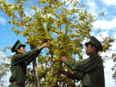 | Chiến sĩ Đồn Ia R'vê chăm sóc mai đón Xuân. |