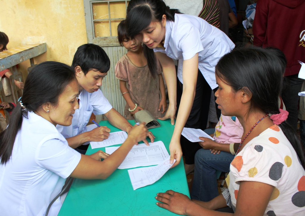 Các y-bác sĩ Bệnh viện Đa khoa tỉnh và Hội Thầy thuốc trẻ tỉnh khám cho người dân buôn Kon Tây. |