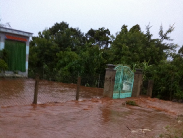 | Đoạn đường trước trụ sở UBND xã Dray Bhăng bị ngập hoàn toàn |