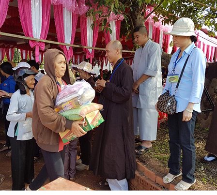 | Ông Bùi Văn Ngọc, Chánh Văn phòng Ban ATGT tỉnh trao tặng mũ bảo hiểm cho đoàn viên, thanh niên. |
