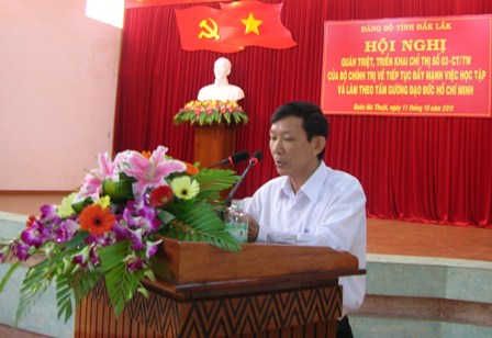 Trên cơ sở mục đích, yêu cầu và các nội dung chủ yếu cần thực hiện của Chỉ thị 03, Tỉnh ủy Dak Lak đã xây dựng và ban hành Kế hoạch số 17-KH/TU để triển khai việc HT<TGĐĐHCM trên địa bàn tỉnh với mục đích tiếp tục đẩy mạnh và đưa việc HT<TGĐĐHCM trở thành nhiệm vụ thường xuyên của các tổ chức đảng, xây dựng Đảng bộ và toàn hệ thống chính trị trong sạch vững mạnh; không ngừng nâng cao đạo đức cách mạng cho đội ngũ cán bộ, đảng viên, công chức, viên chức, chiến sĩ lực lượng vũ trang, hội viên, đoàn viên các đoàn thể chính trị-xã hội và nhân dân.