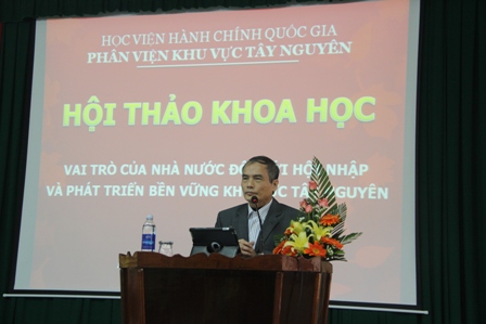 | Đại diện lãnh đạo TP. Buôn Ma Thuột trình bày báo cáo tham luận về thực hiện công tác tôn giáo trên địa bàn |
