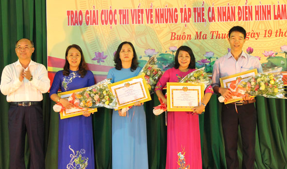| Lãnh đạo huyện Cư M'gar trao Giấy khen tặng các tập thể có thành tích xuất sắc trong 3 năm thực hiện Chỉ thị 05. Ảnh: Hoàng Gia |