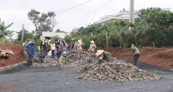Những ngày này, không khí làm đường giao thông nông thôn tại buôn Đrao diễn ra rất sôi nổi. Ngay khi 134 mét đường đầu buôn vừa hoàn thành, những hộ dân ở cuối buôn cũng động thổ, khởi công xây dựng 138 mét đường ngõ xóm. Chung tâm trạng như nhiều hộ dân sống ở trục đường này, ông Y Bhưn Niê phấn khởi lắm, bởi chỉ vài hôm nữa thôi, con đường sẽ hoàn thành, mọi người không còn phải chịu cảnh lầy lội mỗi khi mùa mưa về. Ông cho biết, tuy một số hộ dân ở đây kinh tế còn khó khăn, song khi nghe tin chính quyền địa phương có chủ trương làm đường, tạo thuận lợi cho nhân dân đi lại, trong đó Nhà nước hỗ trợ 100% xi măng, nhân dân đóng góp cát, đá, ngày công xây dựng thì tất cả các hộ dân đều hưởng ứng. Trong tổng chiều dài 1.100 mét đường ngõ xóm của buôn, đến nay đã bê tông hóa được gần 300 mét, số còn lại từ nay đến cuối năm sẽ hoàn thành.