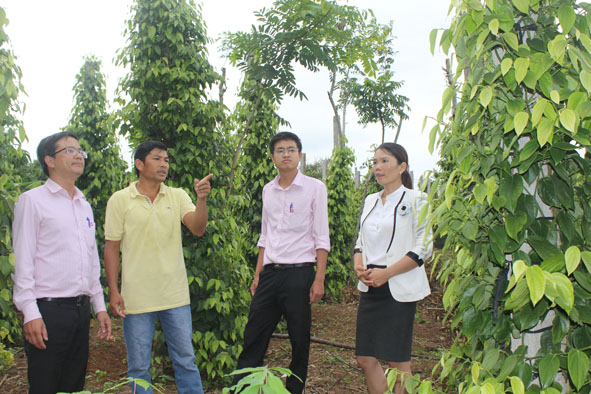 | Trưởng Ban Dân tộc HĐND tỉnh H'Kim Hoa Byă (bìa trái) kiểm tra hiệu quả vốn vay NHCSXH tại huyện Krông Năng. |