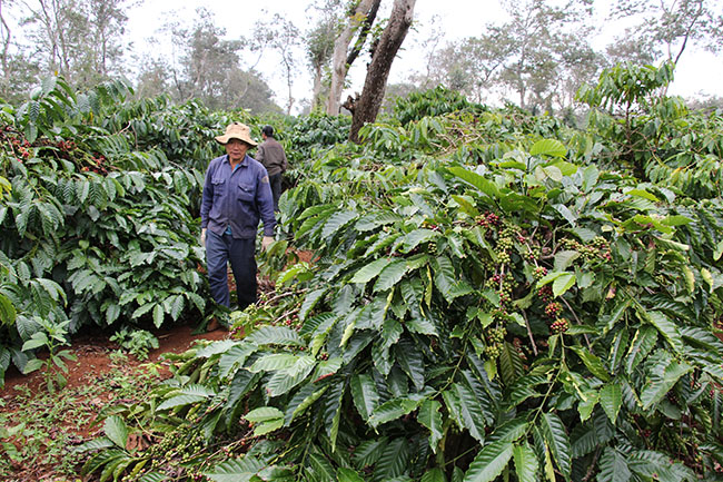 | Học viên lớp chăm sóc cây cà phê tham gia thực hành tại vườn. |