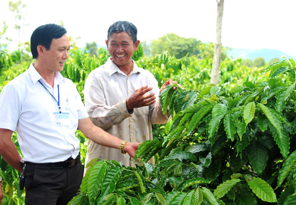 | Cán bộ Hội Nông dân huyện Krông Búk (thứ hai từ phải sang) hướng dẫn kỹ thuật sản xuất cho hội viên nông dân. |