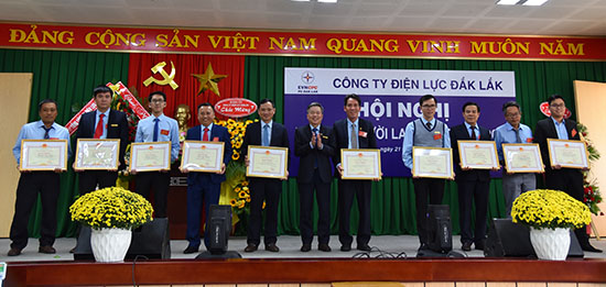 | Đại diện Tập đoàn Công nghiệp Cao su Việt Nam trao tặng Bằng khen của Tập đoàn cho các tập thể của Công ty TNHH MTV Cao su Ea H’leo. |