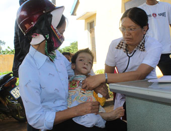 | Các bác sĩ thuộc Hội Đông y huyện Ea Kar đang khám sức khỏe cho cháu Nguyễn Thiên Đức (9 tuổi) |