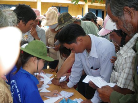| Thanh niên tình nguyện giúp đỡ các y bác sĩ phát phiếu khám cho bà con |