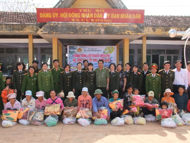 Tại xã Cư K’Bang (huyện Ea Súp), cách TP. Buôn Ma Thuột gần 100 km, đoàn đã đến thăm hỏi, tặng quà tết 200 hộ nghèo và gia đình chính sách của xã, trị giá 50 triệu đồng. Những món quà tình nghĩa này tuy nhỏ nhưng chứa đầy tình cảm và sự quan tâm của phụ nữ Bộ CA đối với những người dân vùng sâu của tỉnh và cũng góp phần động viên để bà con có thêm niềm vui khi tết đến xuân về. Tại thôn 13, xã Cư K’Bang – là thôn có đông bà con người Mông sinh sống từ năm 2007 đến nay - các y, bác sĩ, dược sĩ của Bệnh viện 19-9 – Bộ CA tất bật với công việc thăm hỏi sức khỏe, khám bệnh cho 350 người dân, kê đơn, cấp 1.000 cơ số thuốc điều trị miễn phí cho bà con trị giá 50 triệu đồng. Qua thăm khám, các y, bác sĩ đã xác định bà con nơi đây chủ yếu bị các bệnh về đường hô hấp, hệ tiêu hóa, mắt, suy nhược cơ thể và một số bệnh thông thường khác. Nguyên nhân chính gây ra các bệnh trên là do thói quen lao động, sinh hoạt, ăn uống của bà con chưa hợp lý và môi trường trong thôn chưa vệ sinh… Sau khi cấp thuốc cho bà con, các y, bác sĩ, dược sĩ còn dặn dò bà con cách thức phòng ngừa các bệnh thông thường, cách sử dụng hiệu quả những cây thuốc có sẵn trong vườn, rẫy của gia đình và biện pháp giữ gìn, tăng cường sức khỏe.