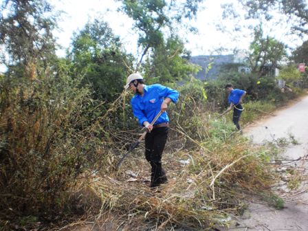 | Đoàn viên, thanh niên tham gia làm vệ sinh môi trường trên tuyến đường liên xã. |