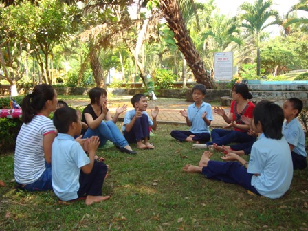 | Chị Nông Thị Thào tặng quà cháu Triệu Văn Quang (con chị Xuân) bị tàn tật. |