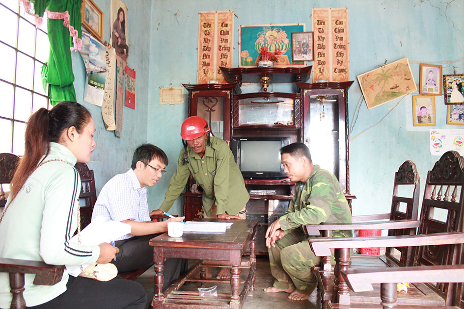 | Cán bộ, cộng tác viên dân số xã Ea Kuêh (thứ hai từ trái sang) tuyên truyền về chính sách dân số - KHHGĐ cho người dân. |