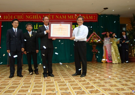 | Phó Bí thư Thường trực Tỉnh ủy, Hoàng Trọng Hải, trao Bằng công nhận Chuẩn Quốc gia cho tập thể Trường THPT Buôn Ma Thuột. Ảnh: Phạm Huỳnh |