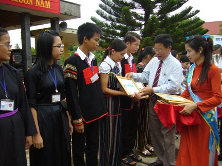 | Phó Bí thư Tỉnh ủy Phạm Đức Tùy trao học bổng "Ươm mầm cho những ước mơ" của Ngân hàng Thương Tín tặng 12 học sinh nghèo, học giỏi của Trường THPT DTNT Nơ Trang Lơng. Ảnh: Minh Quân |