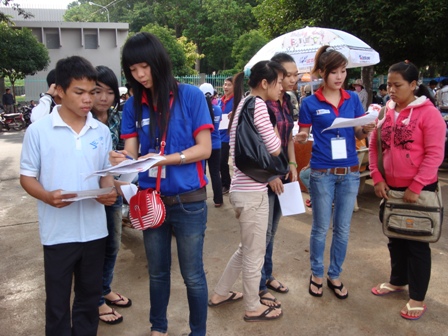| Lực lượng thanh niên tình nguyện đang hướng dẫn thí sinh và người nhà chỗ ăn, ở giá rẻ |