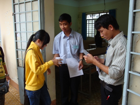 | Thanh niên tình nguyện Trường Đại học Tây Nguyên hướng dẫn thí sinh phòng thi |