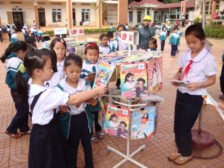 | Mô hình thư viện lưu động luôn thu hút học sinh đến đọc |