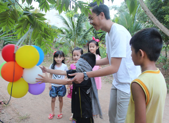 | Cô Hoàng Thị Lang chuyện trò cùng các em nhỏ trong thôn. |