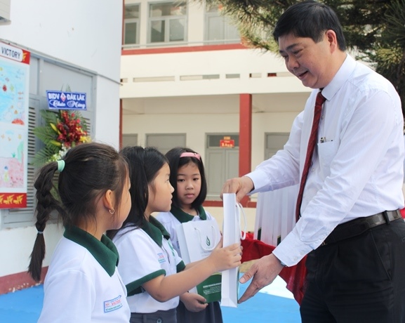 | Lãnh đạo Công ty Cổ phần hợp tác quốc tế TANICO tuyên dương các học sinh xuất sắc. |