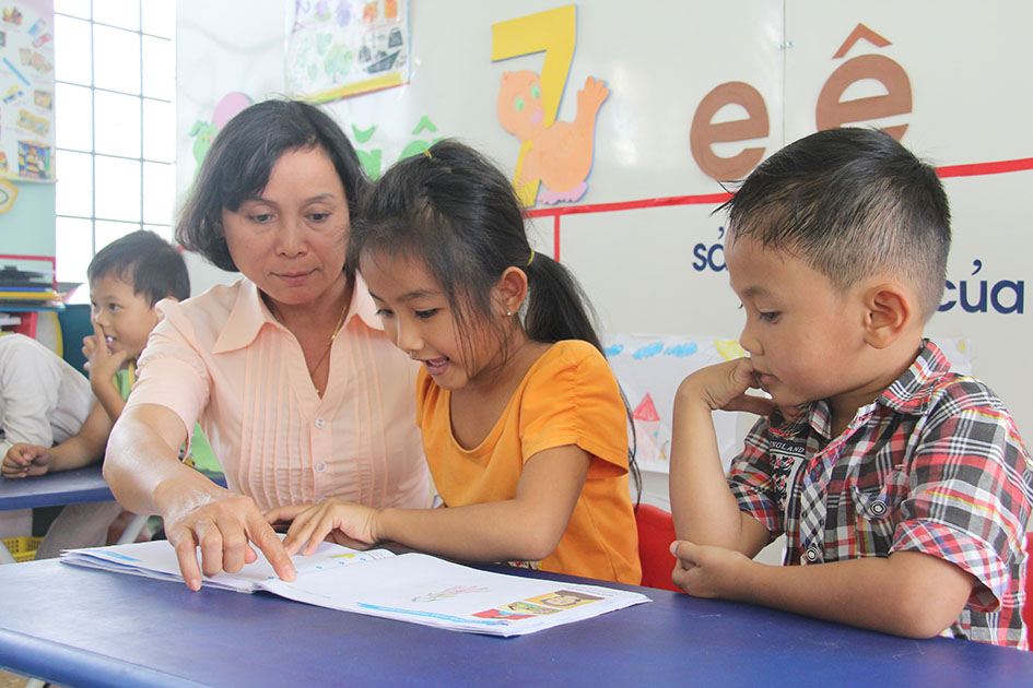 | Cô Vũ Thị Hòa trong một giờ dạy trên lớp. |