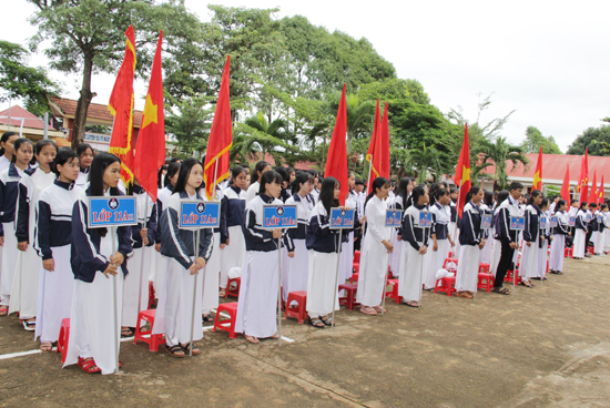 Đồng chí H’Kim Hoa Byă, Trưởng Ban Dân vận Tỉnh ủy, Chủ tịch Ủy ban MTTQ tỉnh đến dự và đọc Thư của Tổng Bí thư, Chủ tịch nước Nguyễn Phú Trọng gửi ngành Giáo dục nhân dịp khai giảng năm học mới 2019-2020.