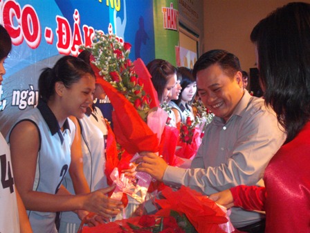 | Phó Chủ tịch UBND tỉnh Trần Sỹ Thanh tặng hoa động viên các nữ vận động viên. |