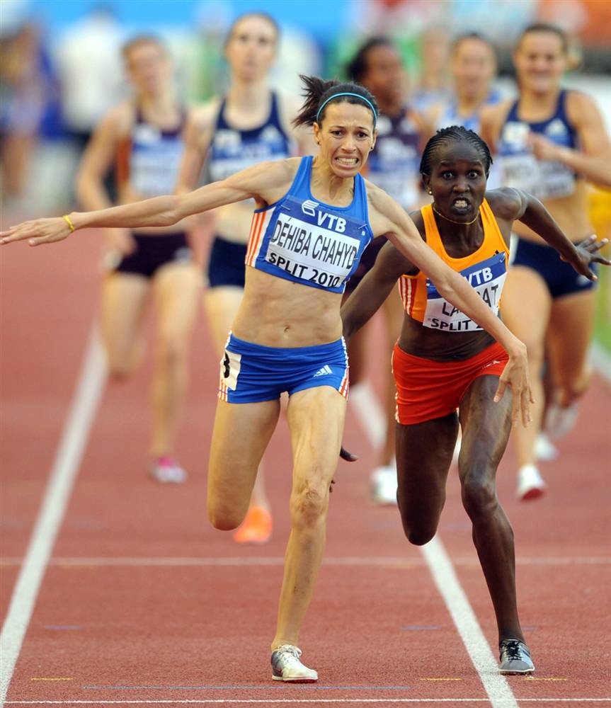 Vận động viên Hind Dehiba Chahyd, Pháp (trái), đang đua tranh với Nancy Jebet Langat người Kenya, trong cuộc đua 1.500 mét nữ ở Giải Điền kinh IAAF Continental Cup, tại Split (Croatia), ngày 5-9.