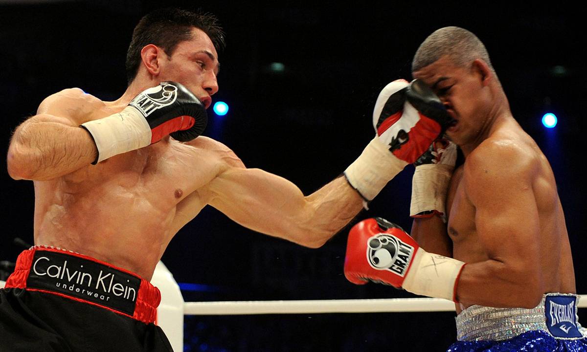 Felix Sturm (trái) đang thi đấu với người thách đấu Giovanni Lorenzo, tại Giải Quyền anh WBA, ở hạng cân Siêu trung, tại Cologne (Đức), ngày 4-9