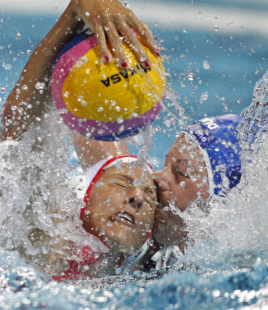 Orsolya Takacs, đội tuyển Hungary (phải), đang tranh bóng với Blanca Gill, đội tuyển Tây Ban Nha, trong trận đấu vòng loại tại Giải Vô địch Bóng nước châu Âu, ở Zagreb (Crotia), ngày 2-9.