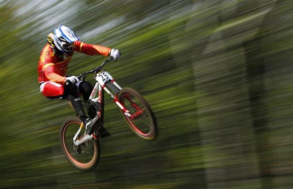 Cua-rơ người Tây Ban Nha, Guardia Bernat Pascual có một cú nhảy ngoạn mục khi đang thi đấu ở nội dung băng đồng nam tại Giải đua xe đạp vô địch thế giới UCI Mountain, ở núi Ste-Anne, Beaupre (Canada), ngày 5-9.