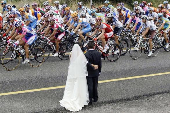 Một cặp vợ chồng mới kết hôn đang cổ vũ cho các vận động viên đua xe đạp ở vòng đua thứ 20 của Giải Tour of Spain "La Vuelta" (Giải đua xe đạp vòng quanh Tây Ban Nha), chặng đua giữa San Martin de Valdeiglesias và Bola del Mundo, ngày 18-9.