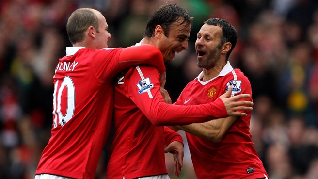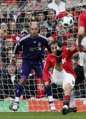 Wayne Rooney(trái) và Ryan Giggs(phải) thuộc CLB Manchester United, đang chúc mừng bàn thắng ngoạn mục của Dimitar Berbatov(ảnh trên), trong trận gặp Liverpool, tại vòng 5 Giải Ngoại hạng Anh, ngày 19-9. Trận này MU thắng Liverpool với tỷ số 3-2.