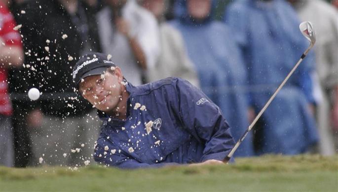 Tay gôn người Nam Phi, Retief Goosen đang đánh bóng từ bãi cát ở lỗ thứ 18, trong vòng chung kết Giải gôn Tour Championship, tại East Lake, Atlanta, bang Georgia (Mỹ), ngày 26-9.