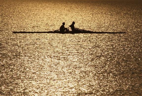 Những người đàn ông đang chèo thuyền tại Sukhana Lake, bang Chandigarh (Ấn Độ), ngày 24-9.