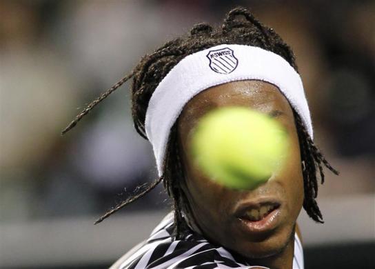Tay vợt người Pháp, Gael Monfils trong một pha đánh bóng trả lại tay vợt Radek Stepanek(Cộng hòa Séc) trong trận bán kết tại Giải vô địch quần vợt Nhật Bản mở rộng, ở Tokyo, ngày 9-10.