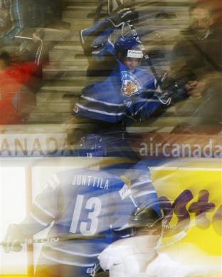 Màn ăn mừng chiến thắng của Joonas Donskoi và Julius Juntilla (13), đội Phần Lan khi chiến thắng đội tuyển Đức và vào được vòng 2 Giải Vô địch thế giới Khúc côn cầu trên băng IIHF World Junior Championships, tổ chức ở Buffalo, New York (Mỹ), ngày 29-12-2010. (