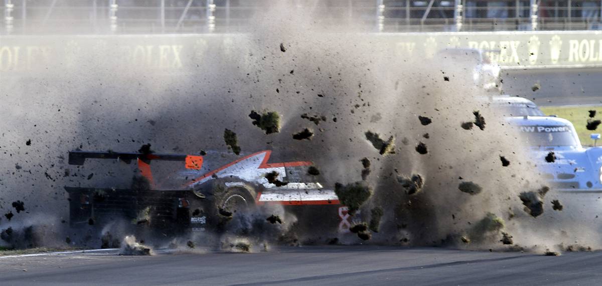 Pha mất lái của Jim Lowe khi lách vào bãi cỏ ở Giải đua xe quốc tế Grand Am Rolex 24 diễn ra ở đường đua Daytona Speedway, Daytona Beach, Florida (Mỹ). (