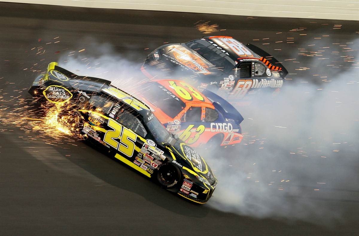 Vụ tai nạn đầy tia lửa và khói của các tay đua Steve Arpin (25), Milka Duno (63) và Steve Blackburn (68) trong vòng đua tự động 200 ở Giải Slick Lucas Oil Mist, trên trường đua tại bãi biển Daytona Beach, Florida (Mỹ), ngày 12-2. (